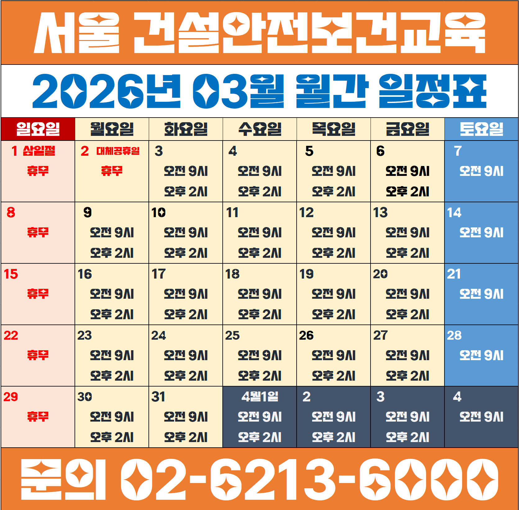 대구 건설업기초안전보건교육 2026년 3월 일정 | 삼일절 휴무 및 대체공휴일 교육 일정 안내